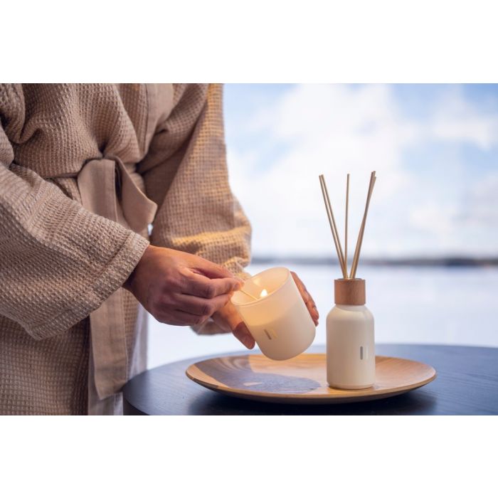 Det eleganta sojaljuset skapar en varm atmosfär i utrymmet med sitt ljus och sin doft. Den stärkande Koivu-doften har försommargrönska och fräscha björklöv. Brinntid ca 24 h.