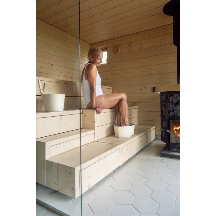 Ett bastuaggregat som återger formen av en droppe på ett vackert sätt och som är tillverkat av biokomposit i Finland. Den rena och skandinaviska designen på Rento Pisara bastuskålar är helt och hållet resultatet av finskt arbete. Den slitstarka och bekväma naturfiberkompositen är ett utmärkt material för värmen och fuktigheten i bastun. Återvinningsbar, brännbar för