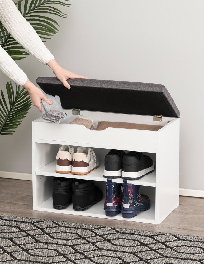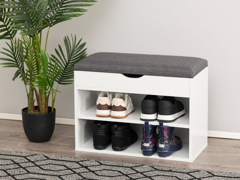 En praktisk hallbänk är en utmärkt hjälp för att upprätthålla ordningen i vestibulerna. Under den stoppade bänken finns förvaringsutrymme för till exempel tillbehör eller andra föremål. Dessutom har bänken två hyllor med en lastkapacitet på 10 kg per hylla. Bänklastkapacitet 130 kg. Däcket har en