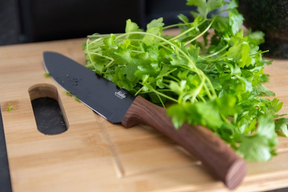 En vacker skärbräda av bambu är skonsam mot knivar och ett antibakteriellt substrat för matlagning. Brädan har ett flytande spår. Handtvätt.