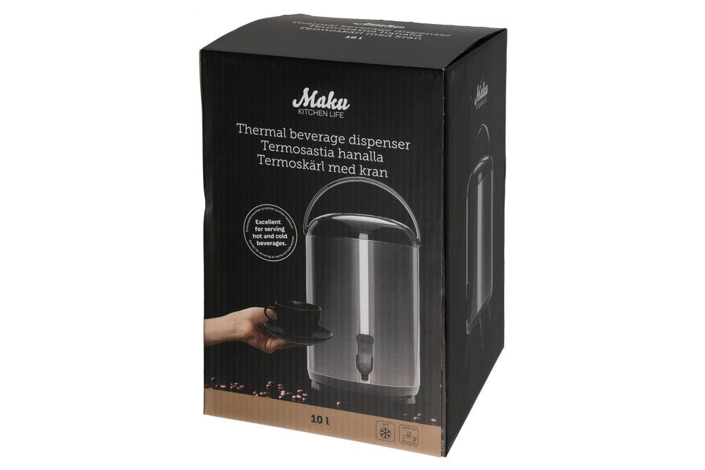 Thermosastia håller drycken varm eller kall i upp till åtta timmar. Termosen är utrustad med en kran, så den är lätt att använda. Ett praktiskt och prisvärt val för fester, sportevenemang, läger, glögg etc. evenemang för att hålla drycken kall eller varm. Toppen av termoskannan är gjord av rostfritt stål och den inre delen är gjord av aluminium. Arbetstemperatur: -20 grader / +90 grader. Kapacitet 10 liter.